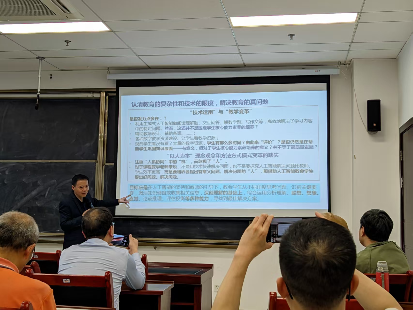 黄廷祝教授结合多年教学实践经验,系统分析了生成式人工智能对高等教育带来的深刻影响与挑战。他强调,在人工智能时代,教师需要重新审视教学理念,既要善于运用新技术赋能传统教育,又要清醒认识教育的复杂性和技术的局限性。黄教授特别指出,未来教育的核心是在人工智能辅助和教师引导的双重作用下,着力培养学生的自主学习能力、问题提出能力和研究思维能力。同时,基础知识和能力、基本科学素养能力等仍是今后的教育重点之一。