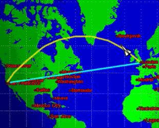 题目:时间和运动 介绍:自开天辟地以来, 人类一直在寻找从A地到B地的更快交通方式。从轮子,到马匹和其他的动物,再到蒸汽机、飞机。现在,最快的交通方式是航天器,如美国宇航局的航天飞机。然而速度并不是行程中的唯一考量,确保选择最短的路线也同样重要。想象你将驾驶着协和式飞机从伦敦到旧金山,那么你不得不在地图上选择一条路线。你会选择以蓝线标记的直线,还是黄线标记的曲线呢? |