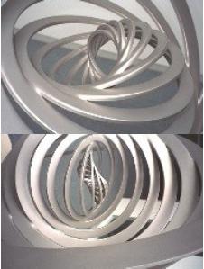 题目:数的艺术 介绍:数学家和艺术家相互怀疑并非闻所未闻,但在艺术与自然界的许多形体具有数量关系。事实上,许多数学家具有强烈的美学创造力。在英国布里斯托尔的惠普校园,一群研究人员正在一个项目的支持下,走入了先进的数学和美妙的艺术世界里。右图是惠普主大厅展览的西蒙托马斯的超锥雕塑,其“柏拉图式的形式”是由一系列经过旋转后的同心环来表示,环的半径呈指数级下降并且每个环的宽度与它的半径成一定比例。 |