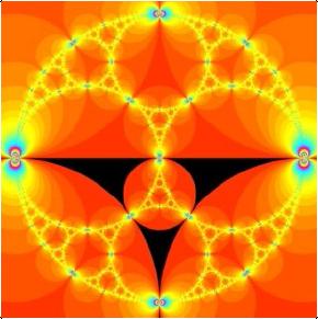 题目:非欧几何与因陀罗珍珠 介绍:许多人会对右图所示的分形之美和复杂性感到惊奇,该分形称为阿波罗垫,是由相切的圆非常复杂地排列。然而很少有人知道象这样的分形与双曲空间的拼接密切相关,在这里我们将探索在这些拼接背后的数学以及它们如何产生漂亮的分形图象。在双曲空间中,距离不是按通常的方式来测量,在双曲测度下,两点间的最短距离不再是沿直线,而是沿不同类型的曲线。 |