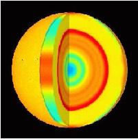 题目:太阳活动 介绍:地质学是通过测量地表振动来研究地震。太阳地质学是太阳物理学中相对比较新的领域,不同的是这里是观测太阳表面的振动,这些振动由太阳内部的驻波形成。在太阳中,我们发现了三维驻波。右图是SOHO卫星上的迈可森多普勒绘图仪观察得到的。这可以表明太阳内部预测的和计算的声波速度间的差别。在红色层,声音比理论预测的传播得更快。蓝色代表声音比预测的速度慢。 |